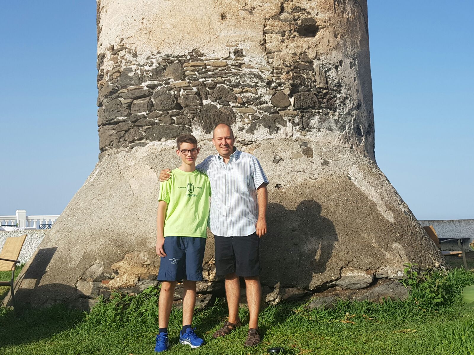 All the nice scenery aside, I am here to help my student Angel Luis Cubas Cabrera from the Canary Islands. He’s ranked 18th on the initial ranking list (you can see the full list here) but he’s much better than what his rating shows. I hope this tournament propels him upwards! Here’s a photo of us in front of the tower:
